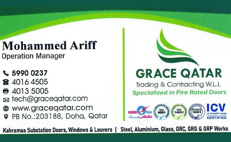 All kind of metal works ( FRD /NFR STEEL DOORS MANUFACTURING PLUS SUPPLY AND INSTALLATION, STRUCTURAL STEEL WORKS, ALUMINUM,UPVC WORK, DELUGE CABINETS, HANDRAILS, STAIRCASE, FABRICATION WORKS,) GRC,GRP, GRG,EIFS WORKS.( marketing@graceqatar.com- 59991346)