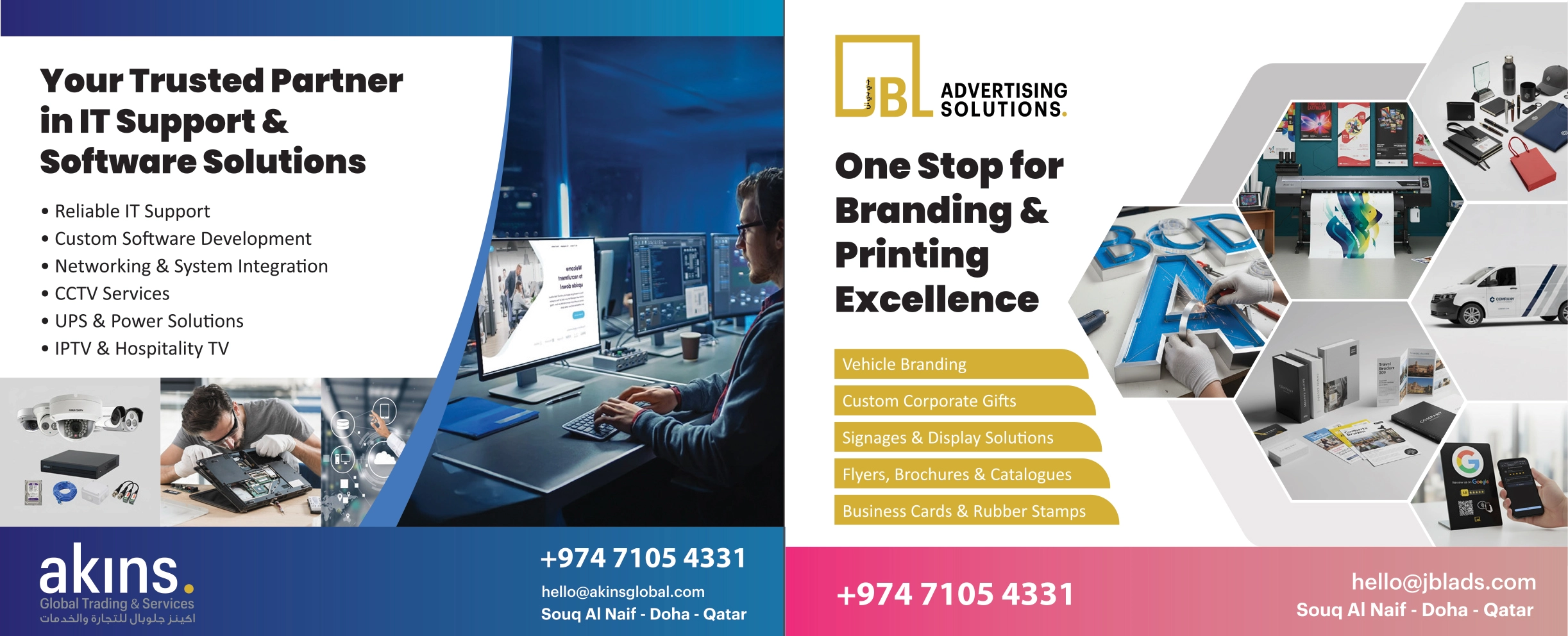 JBL Advertising Solutions delivers precision Branding, Signage, and Digital Marketing in Qatar. Specialists in creative development, 3D signs, offset printing, and comprehensive corporate solutions.