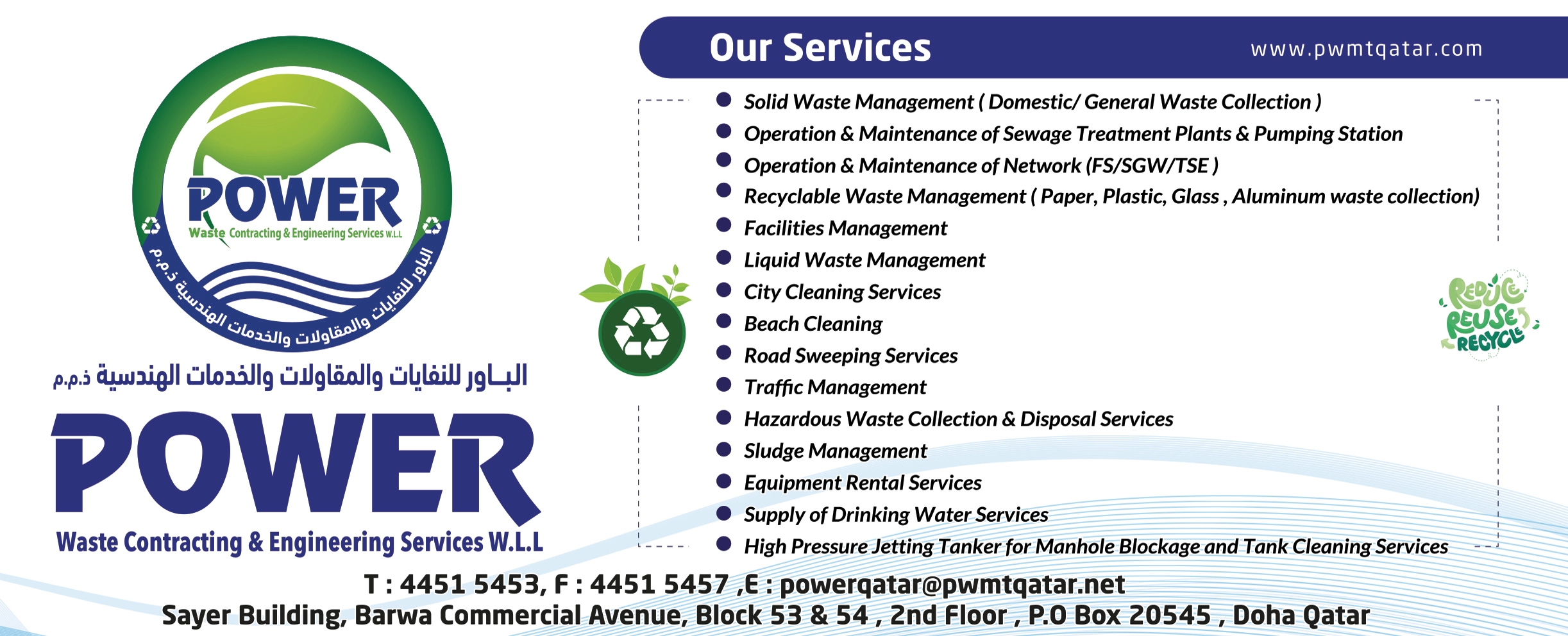 Power Waste Contracting & Engineering Services provides professional sewage management, waste collection, transportation, and recovery solutions in Qatar.