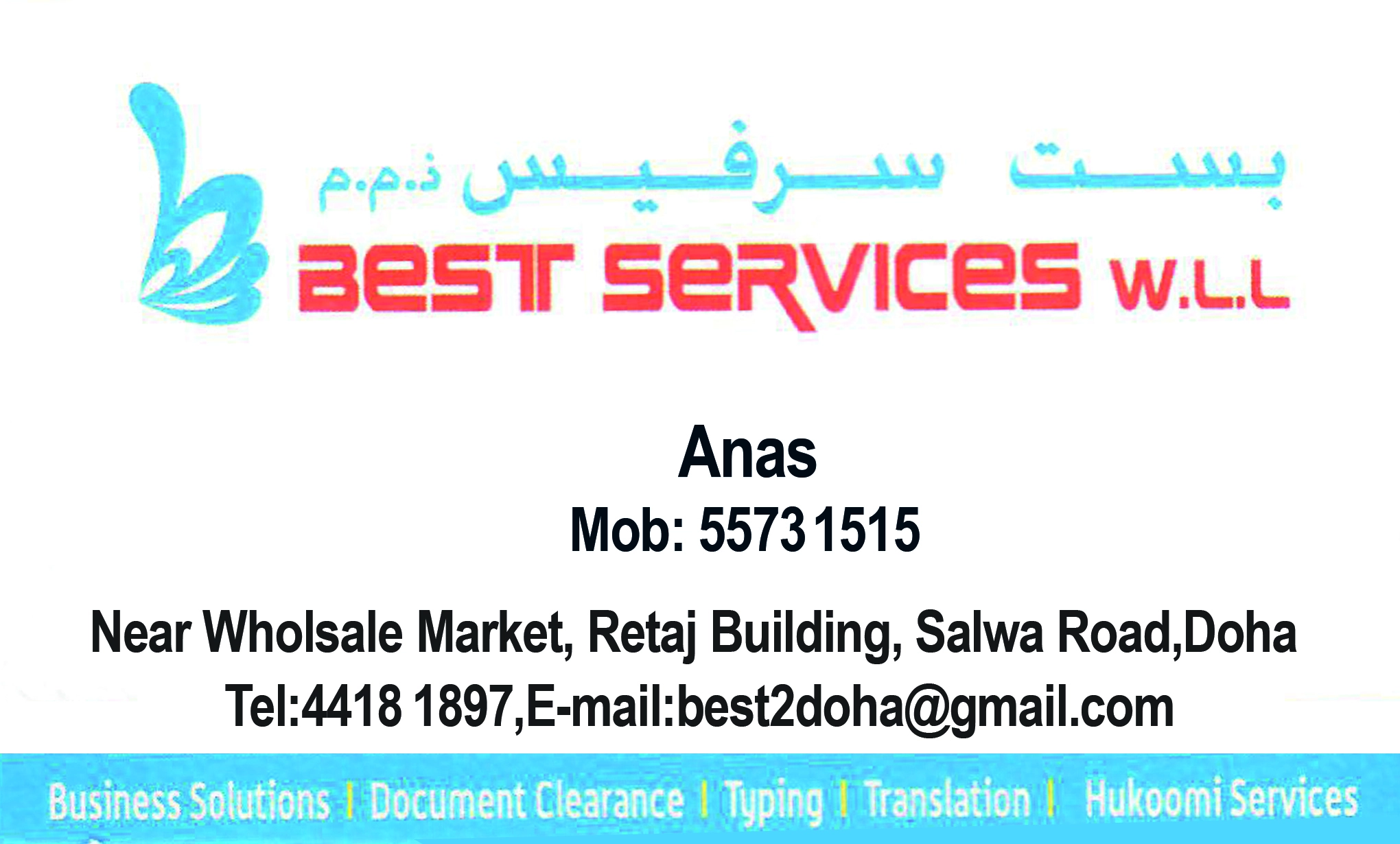 Get accurate and professional typing and documentation services at Best Services W.L.L in Qatar. Fast, reliable, and precise solutions for all your paperwork needs. Listed on QBCD – Qatar’s trusted Business Card Directory.