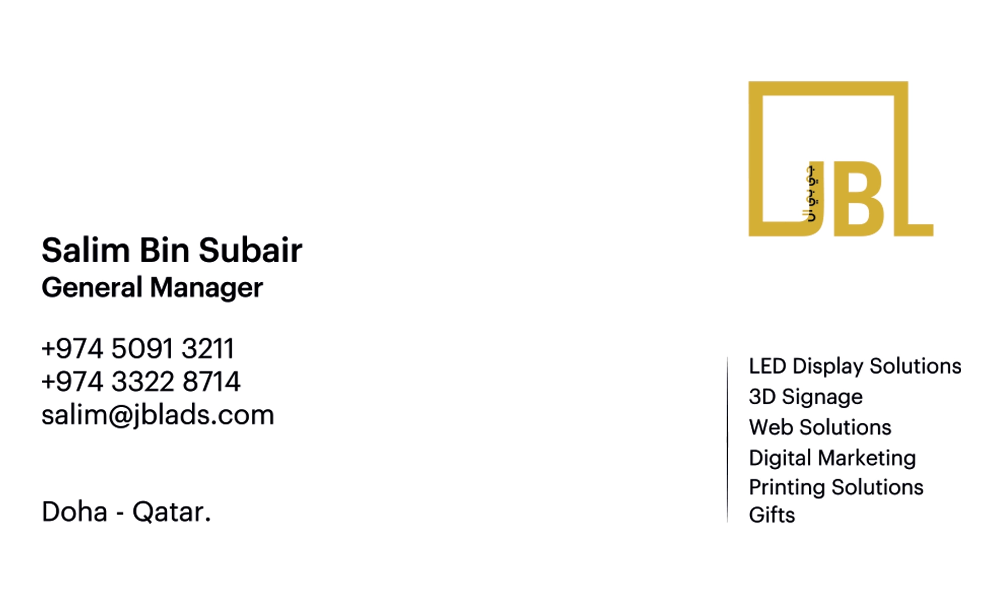 JBL Advertising Solutions delivers precision Branding, Signage, and Digital Marketing in Qatar. Specialists in creative development, 3D signs, offset printing, and comprehensive corporate solutions.